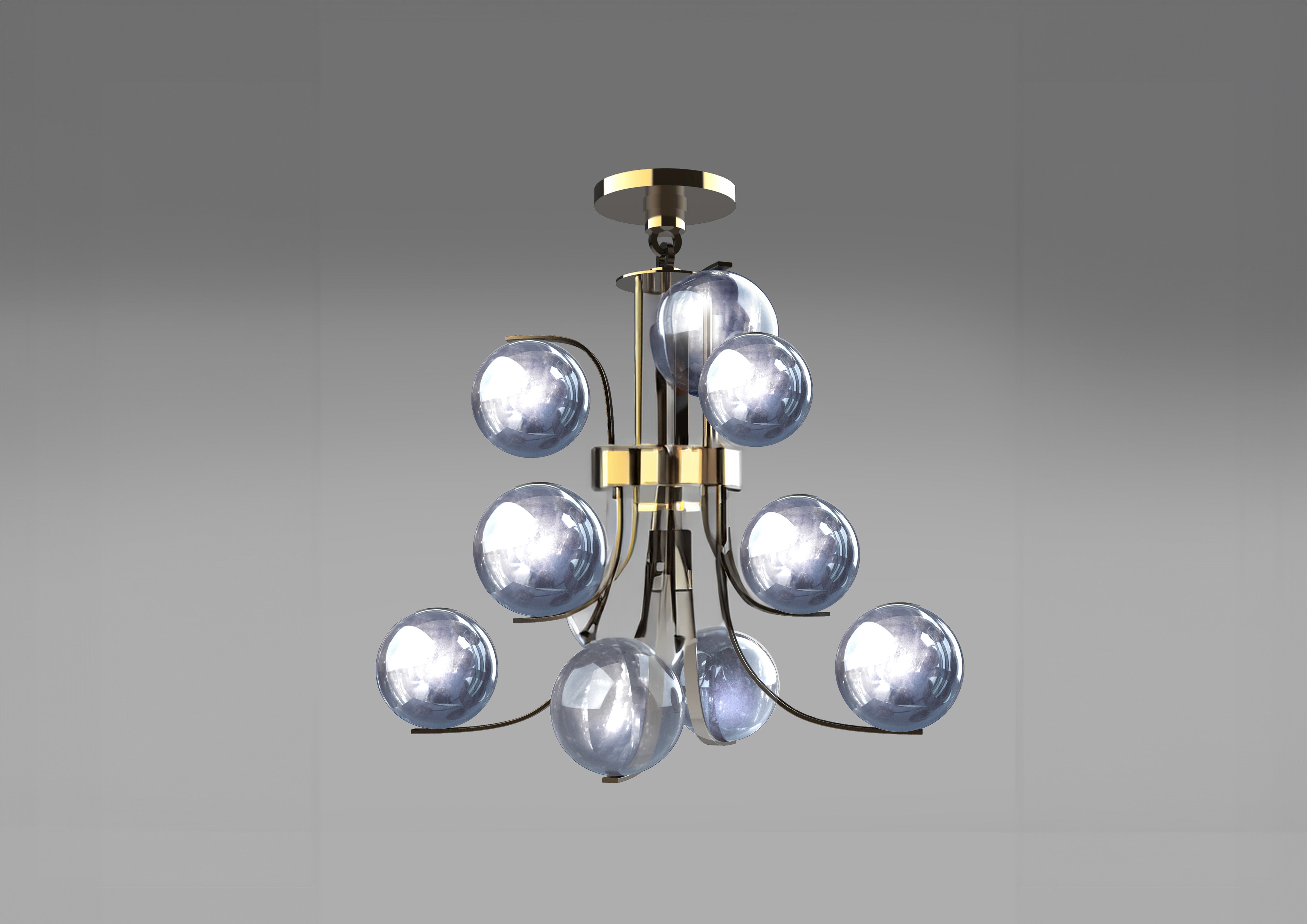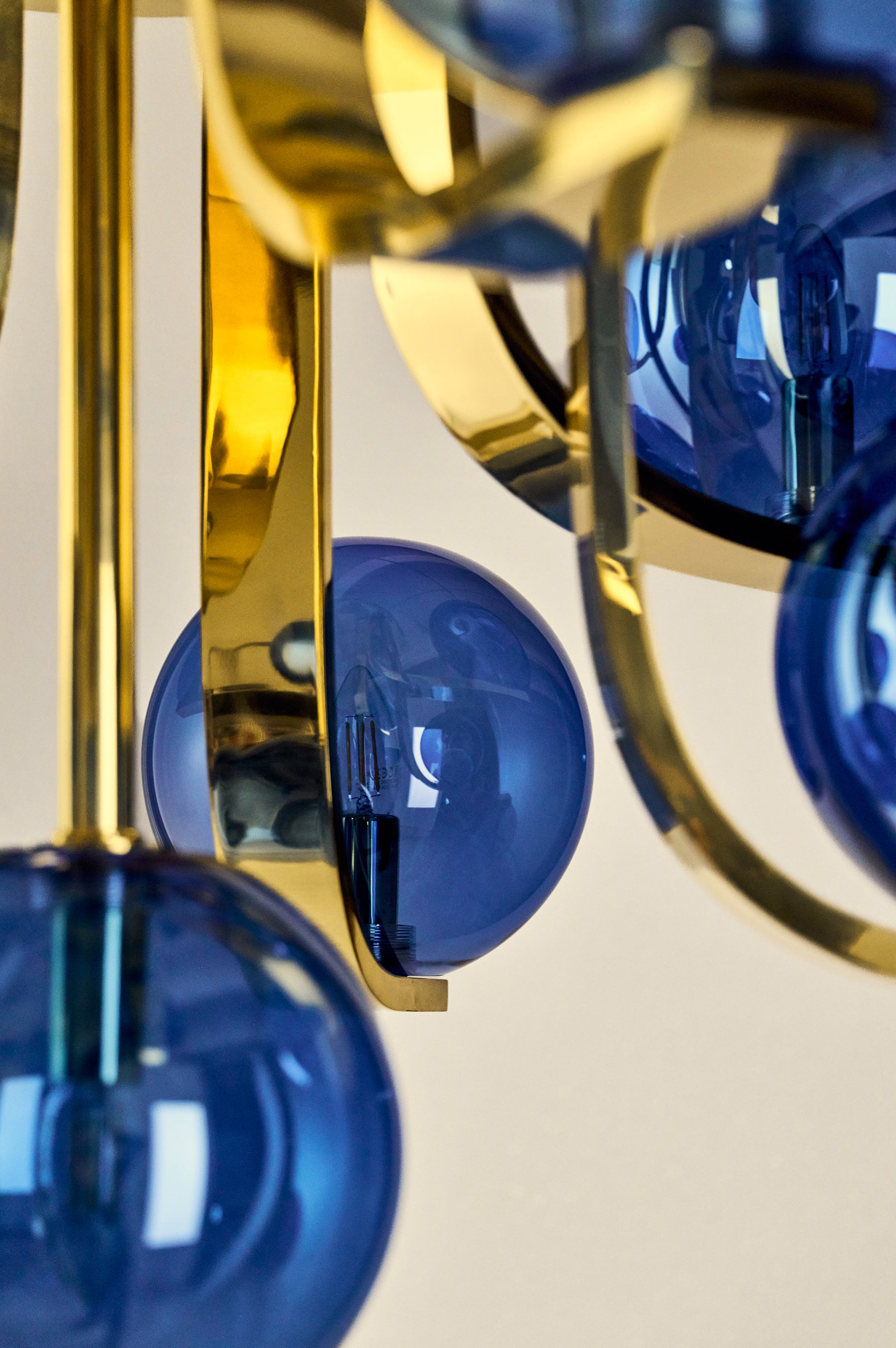 The glass bubbles, available in various shades, were designed to evoke a play of light and shadow, lending rooms an elegant and refined atmosphere. Hand-chiseled brass adds a timeless aesthetic to the collection.