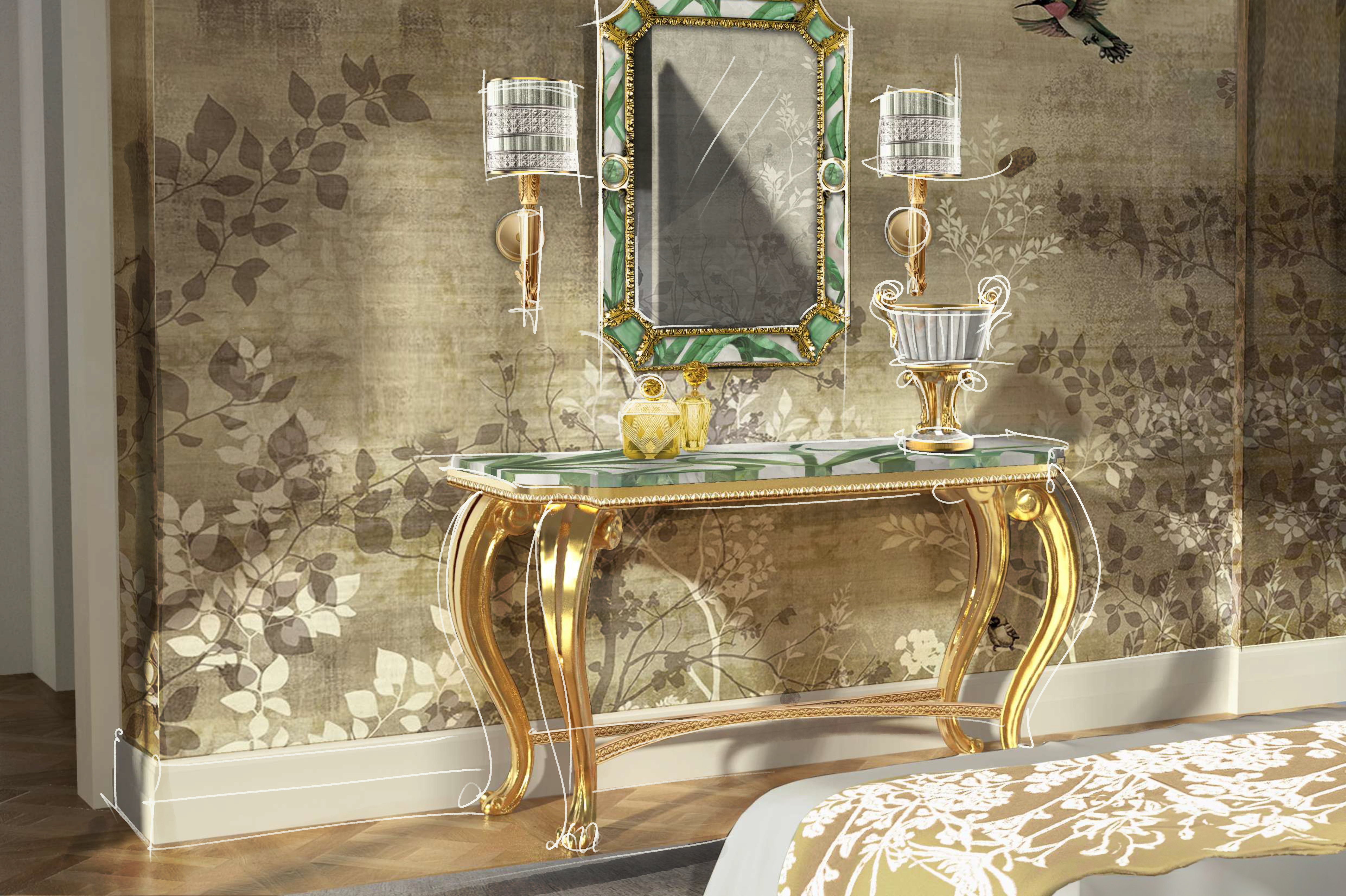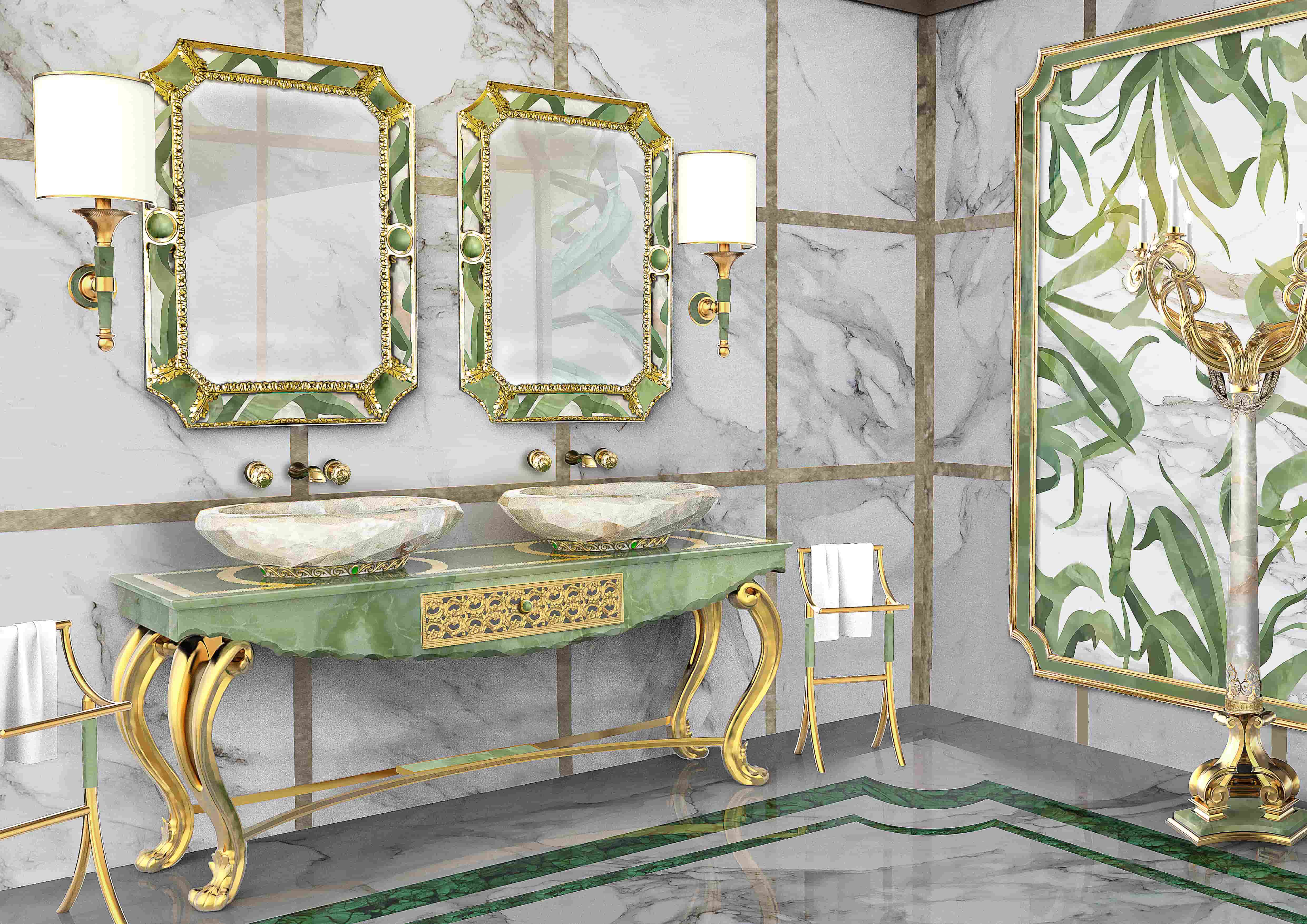 Malachite, symbol of paradise and beauty, is worked to create harmonious and contrasting effects. This series pays homage to the ancient art of stone inlay, reinterpreted in a modern and luxurious way, enhancing the culture of Italian craftsmanship.