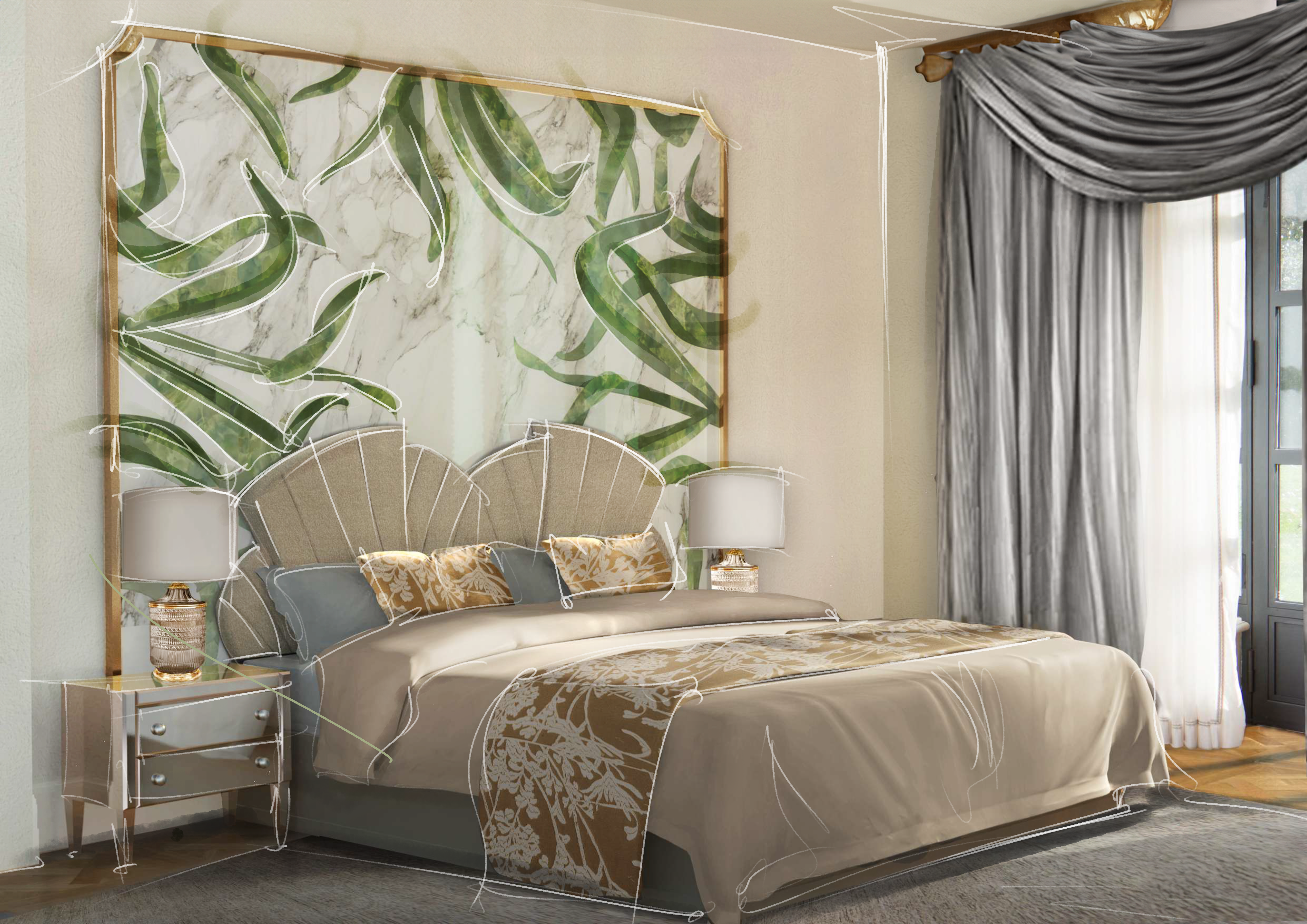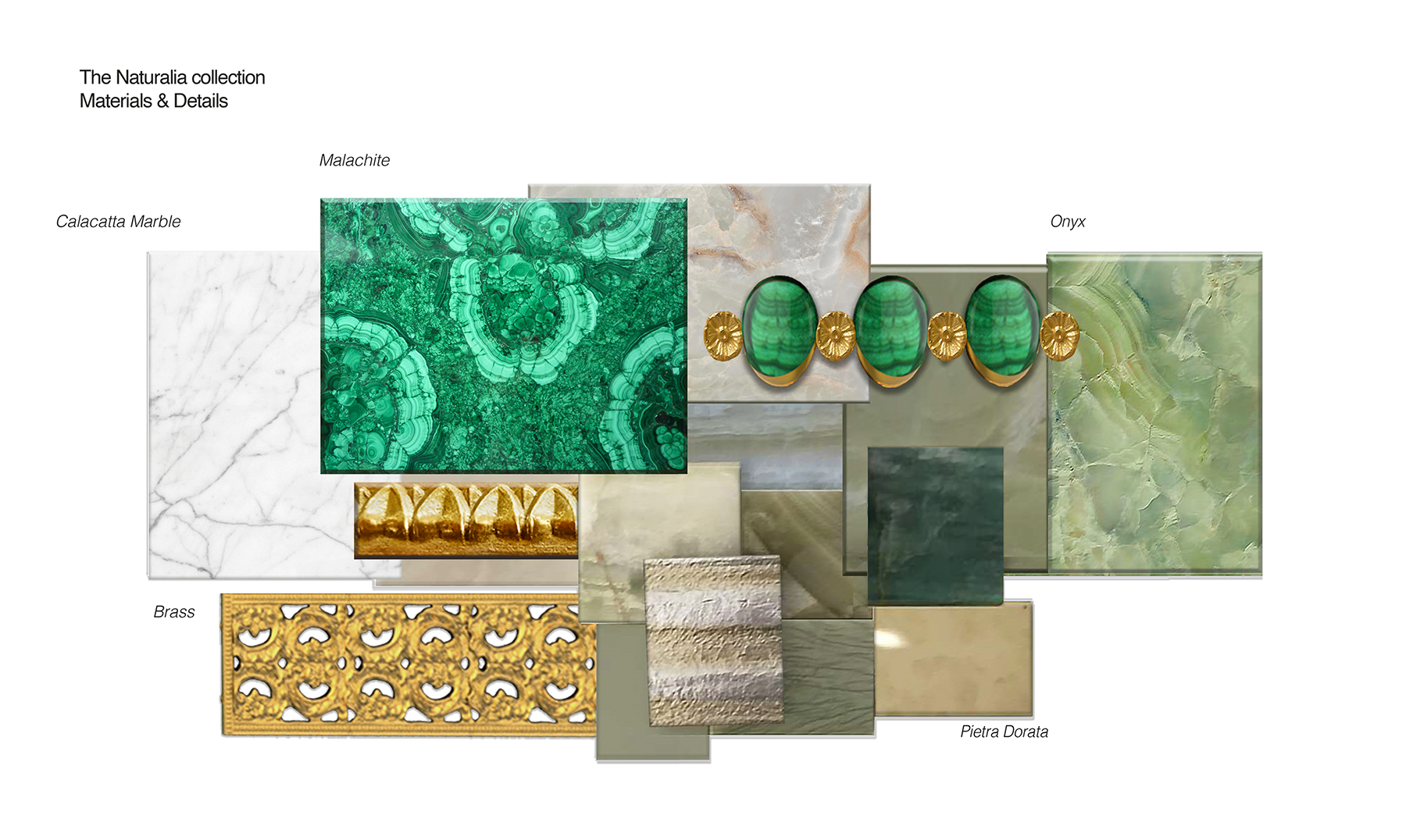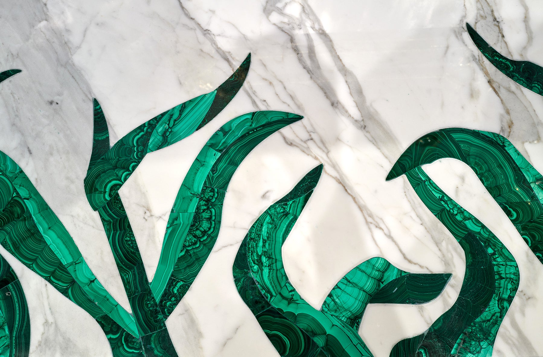 The Naturalia Collection showcases a Malachite inlay, crafted to replicate a pattern of leaves swayed by the wind. Alternating dark and light hues of the semi-precious stone create depth and intricacy to the design.