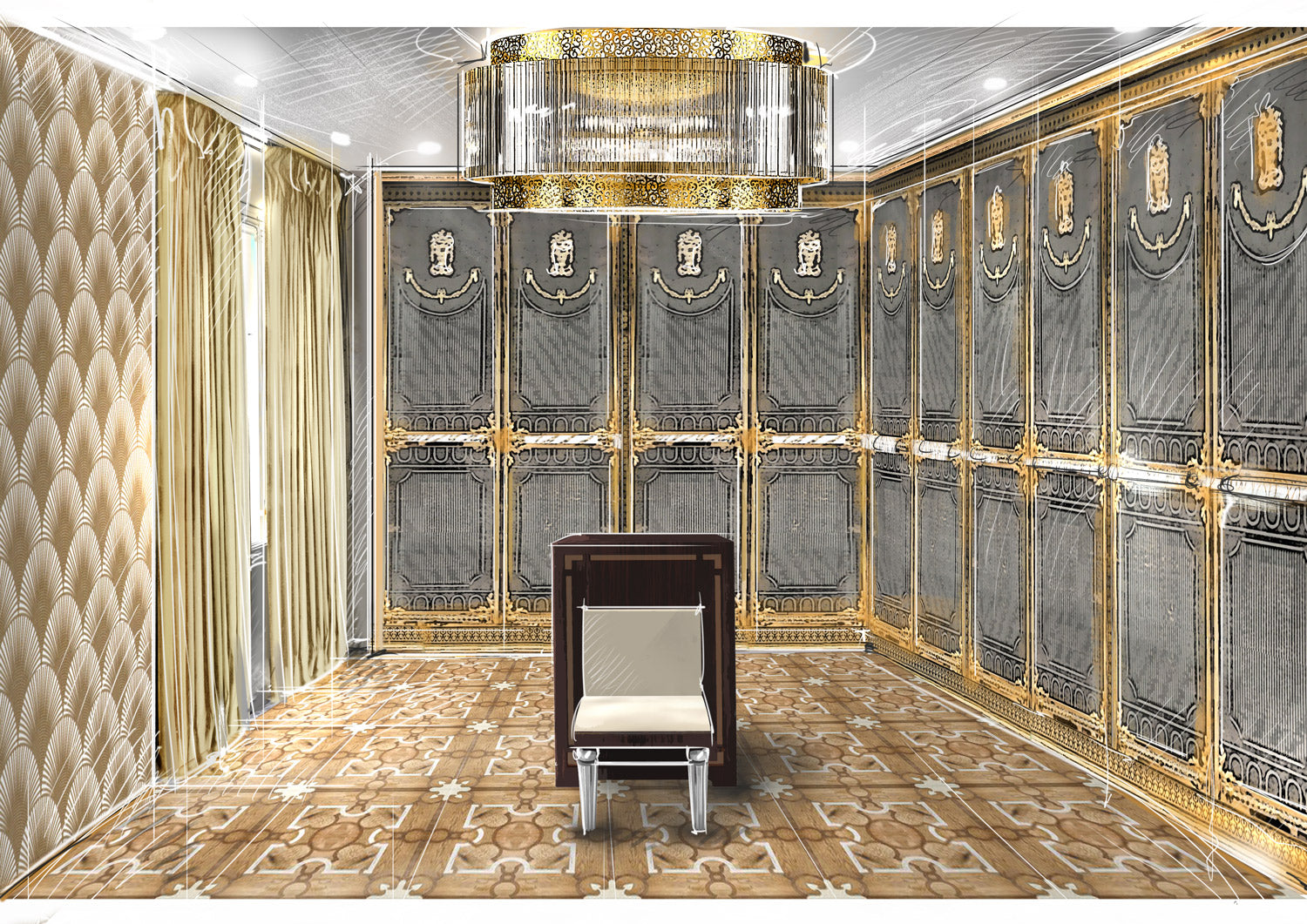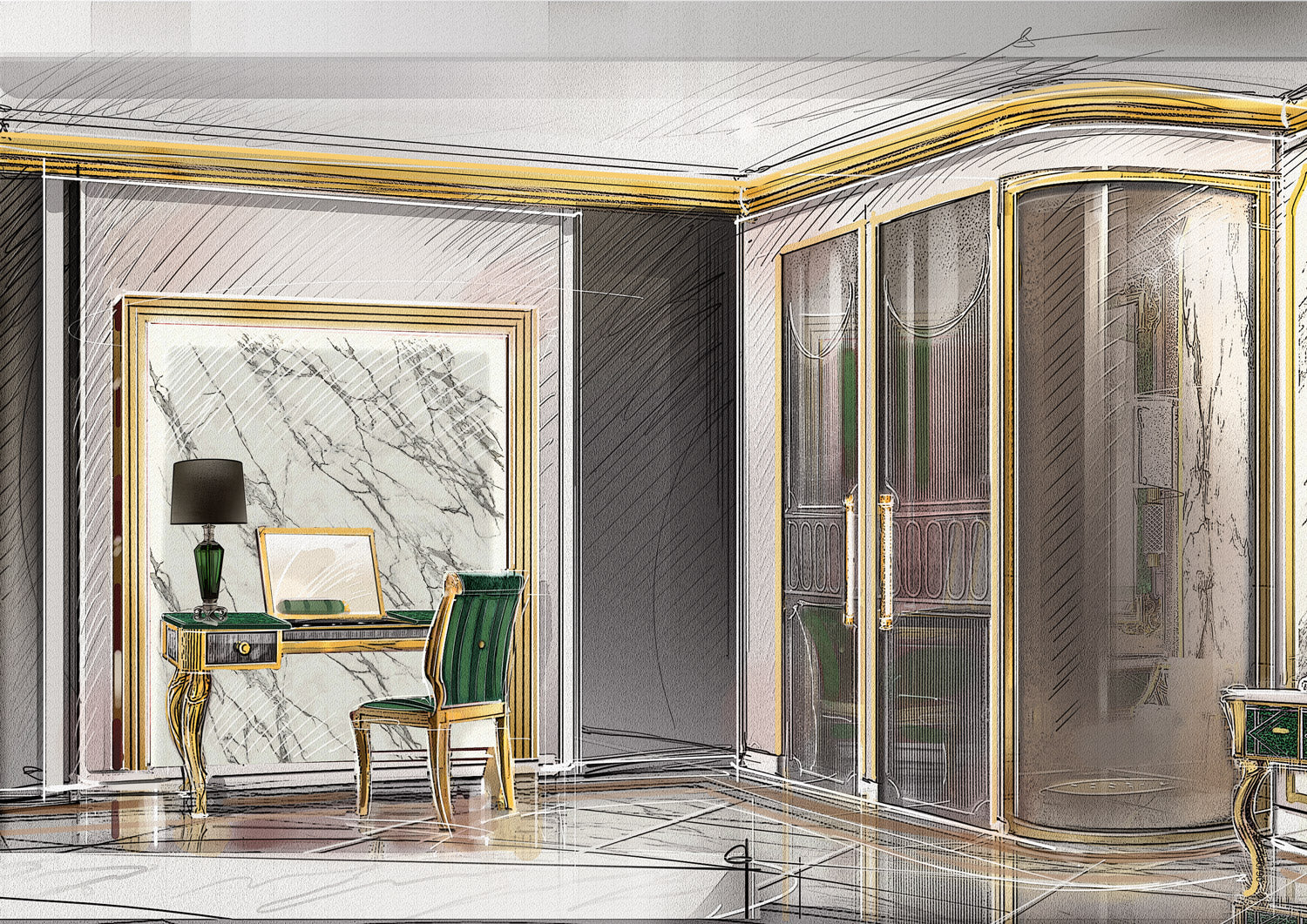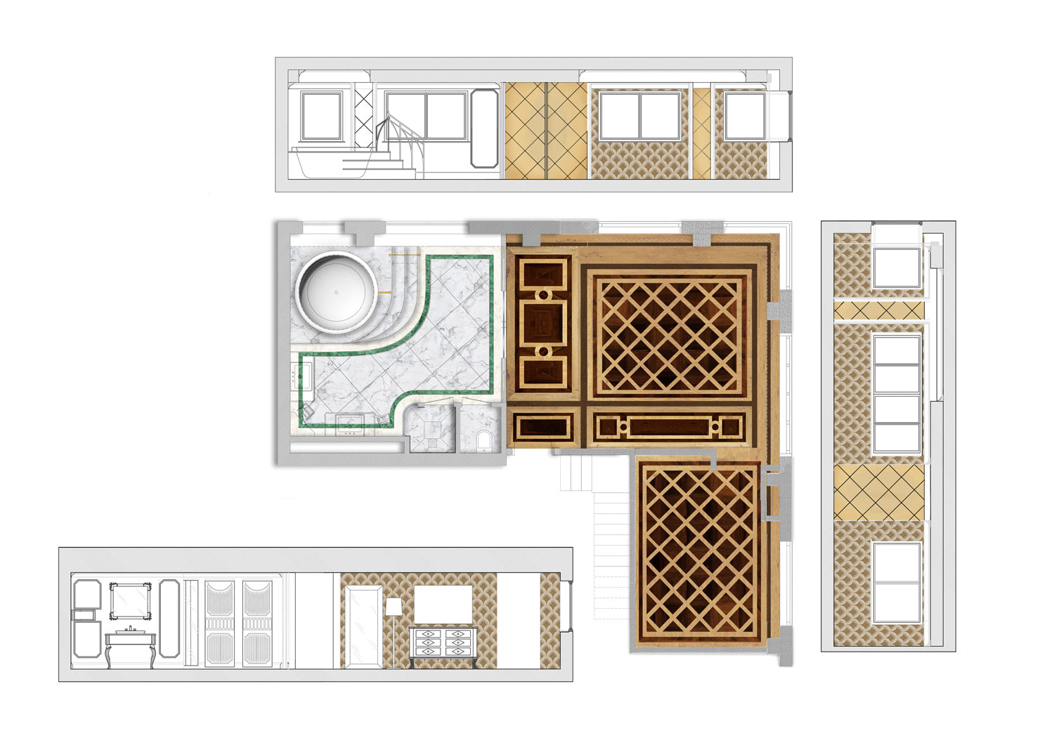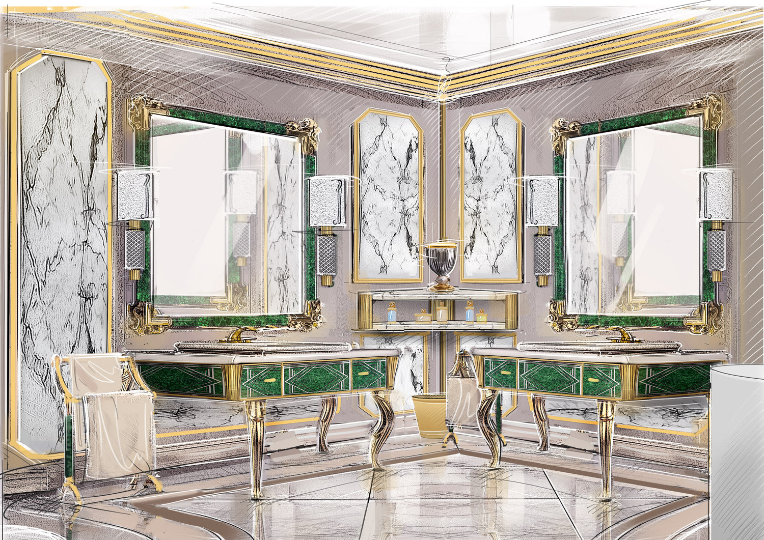 For the London apartment, our vision was to create an environment that combined contemporary elegance and absolute comfort, using a range of materials that included malachite, used as the dominant motif in the bathroom area. This gemstone, known for its deep green and natural patterns, brought a touch of brightness and luxury, in stark contrast to modern surfaces. In the sleeping area, inlaid wooden floors added an additional layer of sophistication and warmth, completing the apartment's refined aesthetic.